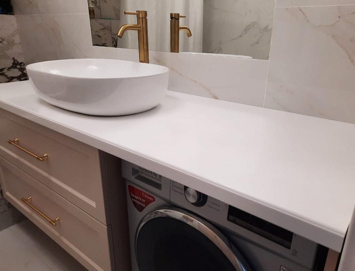 Мы снова удлинили столешницу, чтобы внутрь корпуса тумбы можно было поставить стиральную машину. Это экономит пространство и выглядит стильно.
