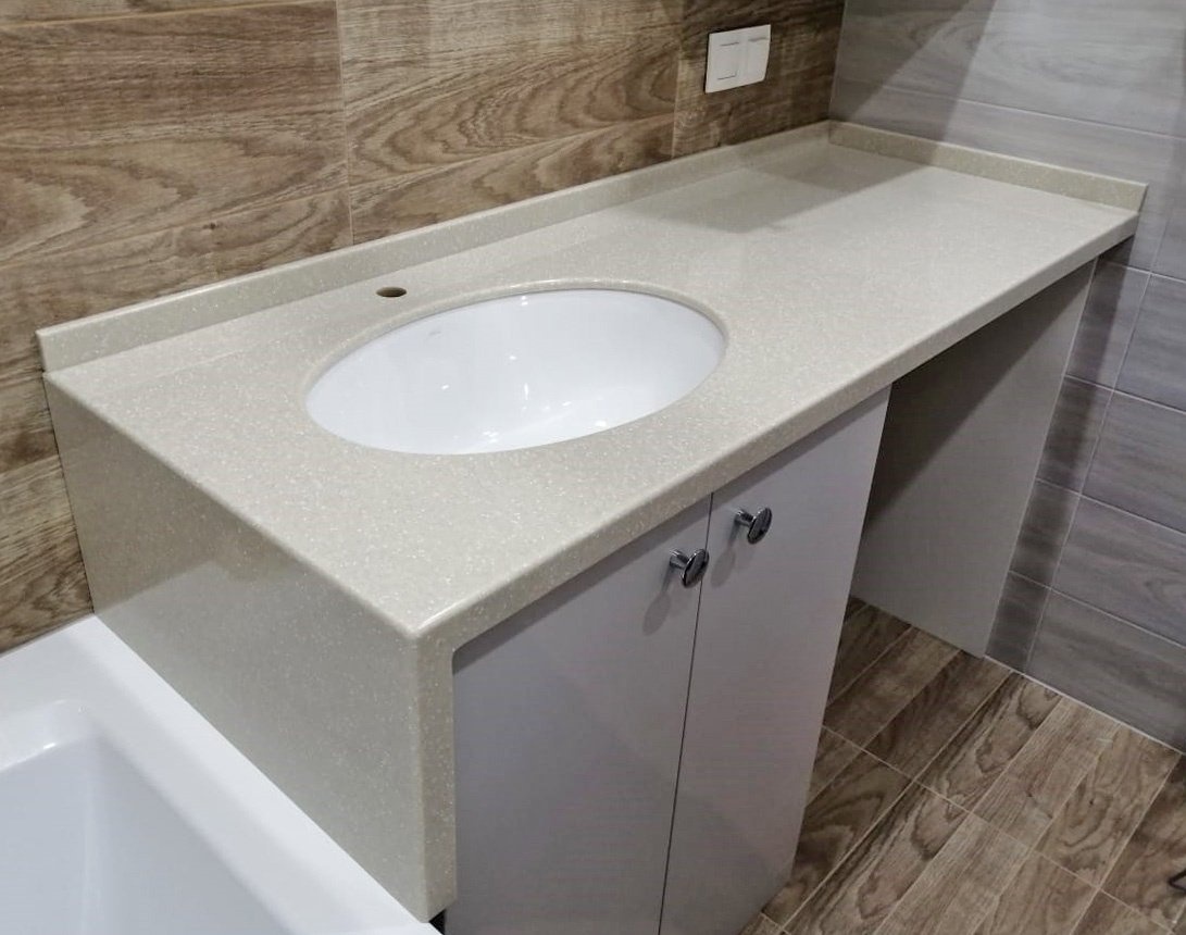 Размер столешницы 1420х550 мм. Акриловый камень выбрали компании Hi-Macs G038 в бежевом цвете с вкраплениями. Заранее был сделан вырез под интеграцию мойки.