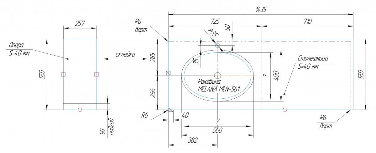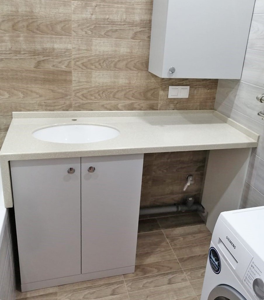 Столешницу из искусственного камня мы устанавливали на уже готовую тумбу для ванной.