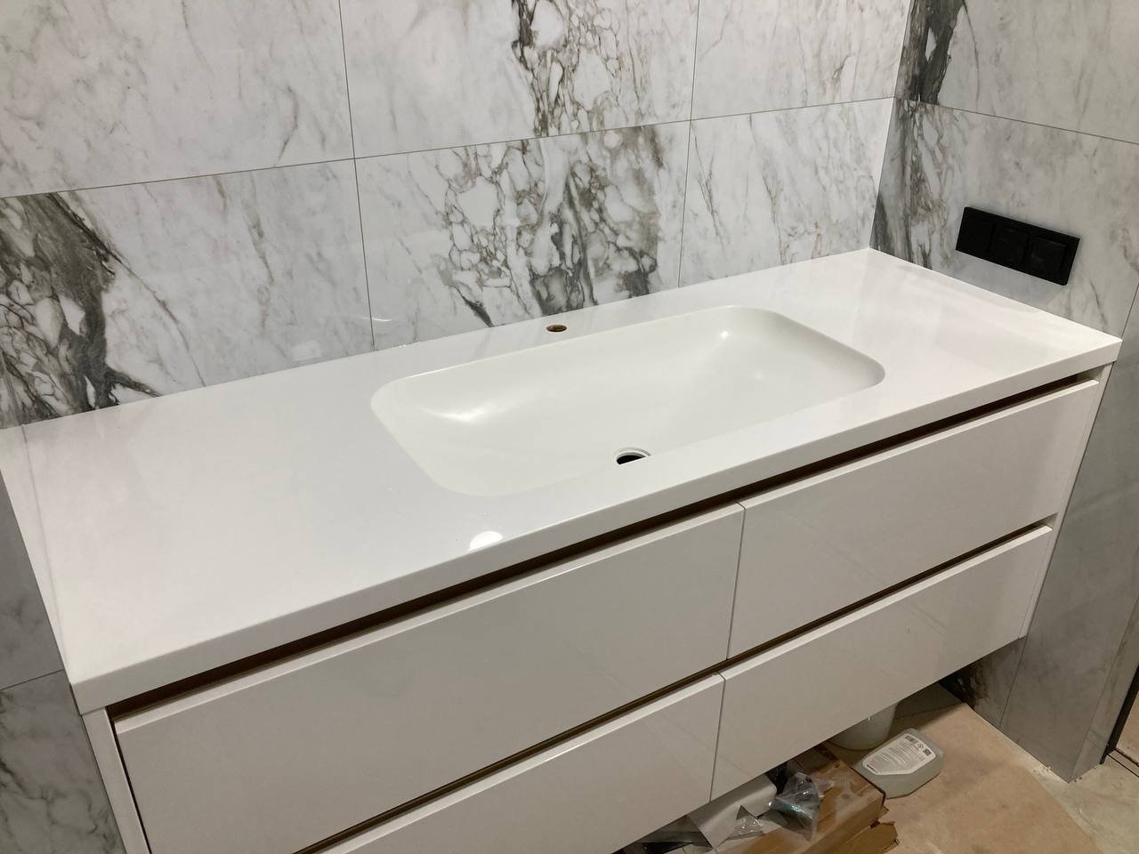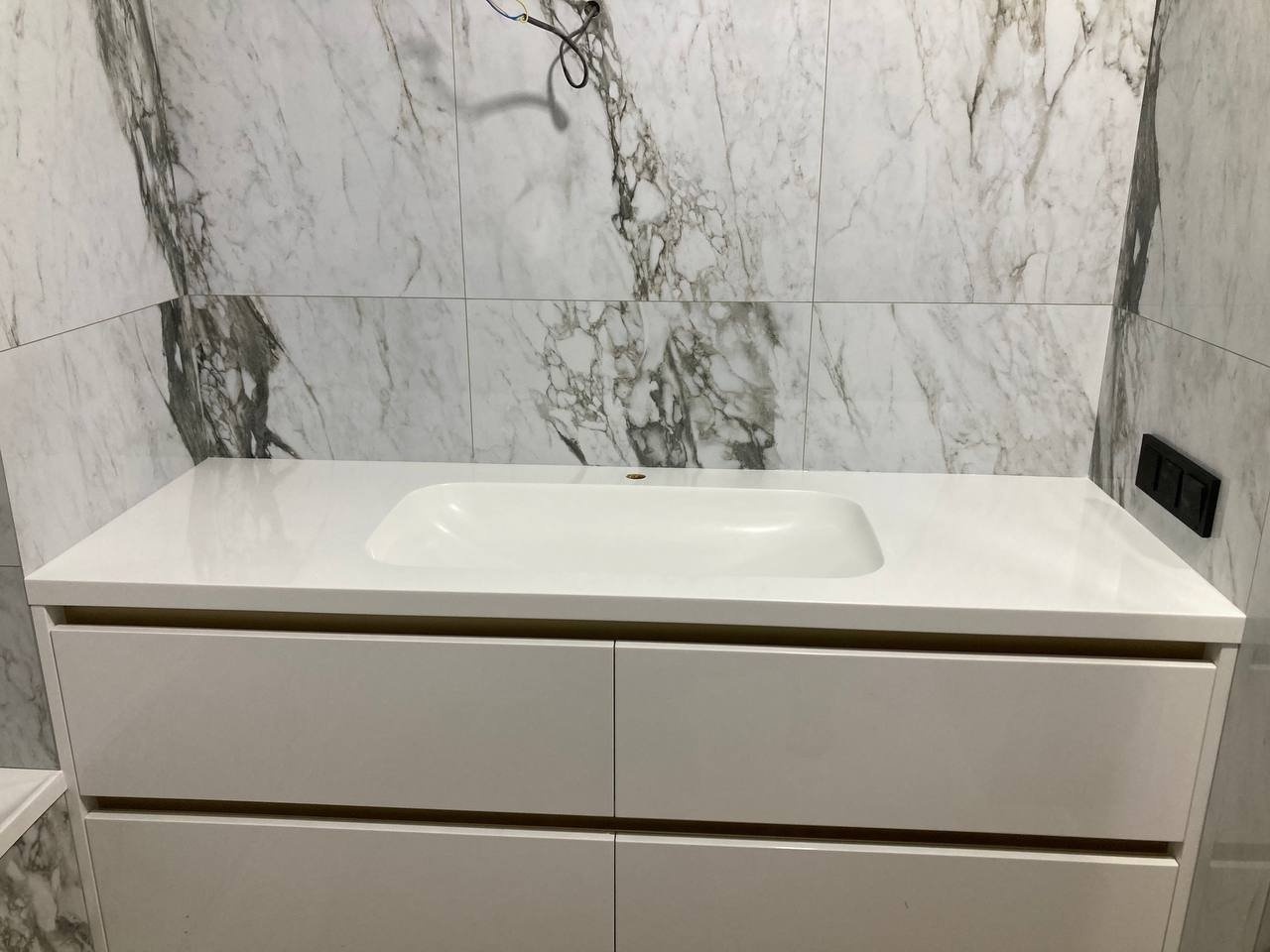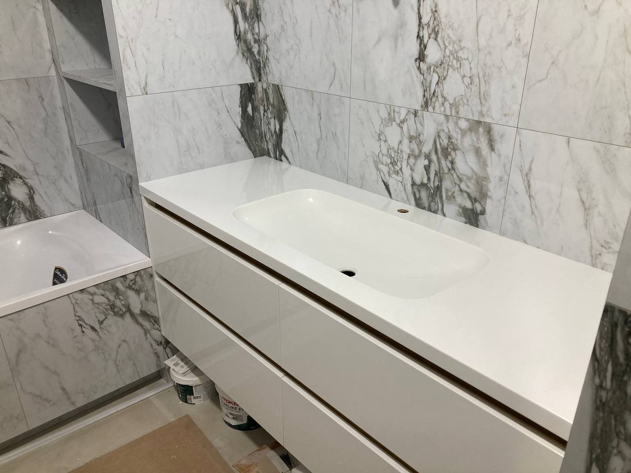 Изготовление и установка прочной столешницы с интегрированной раковиной из акрилового камня Grandex Pure White P-104. В процессе работы мы уделили особое внимание каждой детали, чтобы результат был долговечным. Столешница выполнена из высококачественного акрилового камня, который обладает высокой стойкостью к царапинам, влаге и легко моется, что делает её идеальным решением для кухни или ванной комнаты.