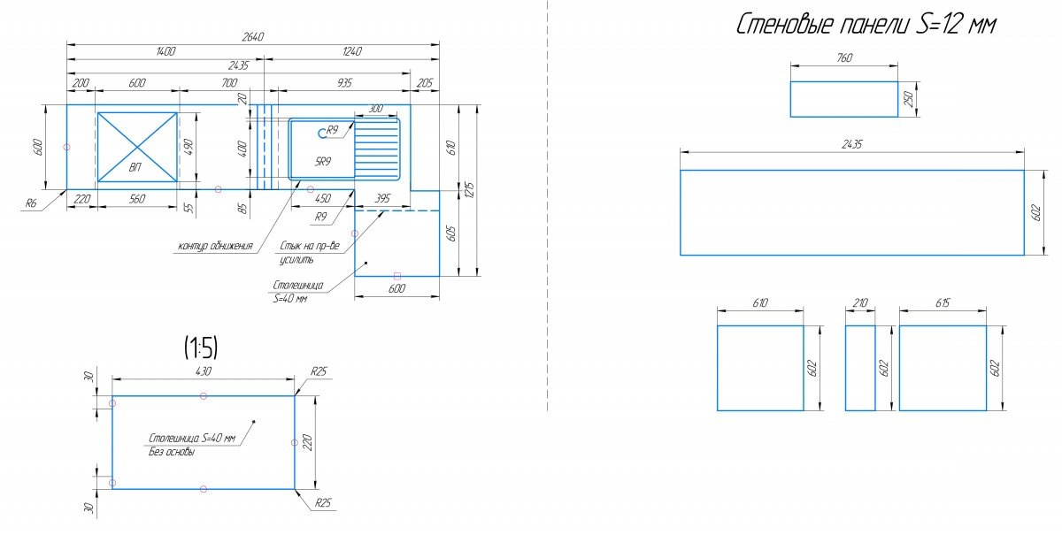 Проект угловой кухонной столешницы нестандартный, так как прилегающая стена имеет необычную форму, за счет чего образует несколько углов.