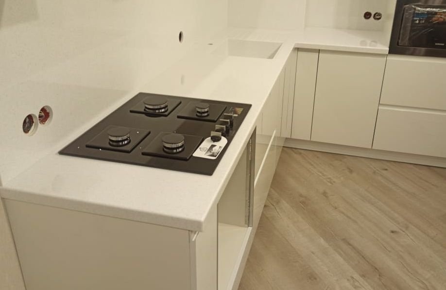 Заранее на столешнице сделали вырез под газовую варочную панель и интегрированную мойку с усилением и термозащитой. Модель мойки: 5R9 400x185 c обнижением (эффект "утопленной мойки").
