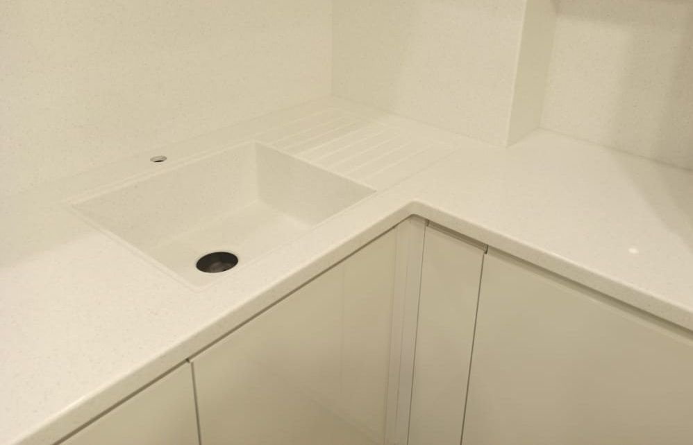 Камень для будущих изделий выбрали Hi-Macs G501. Цвет: бежевый с вкраплениями. Искусственный камень известен своей прочностью, термостойкостью и способностью отталкивать влагу.