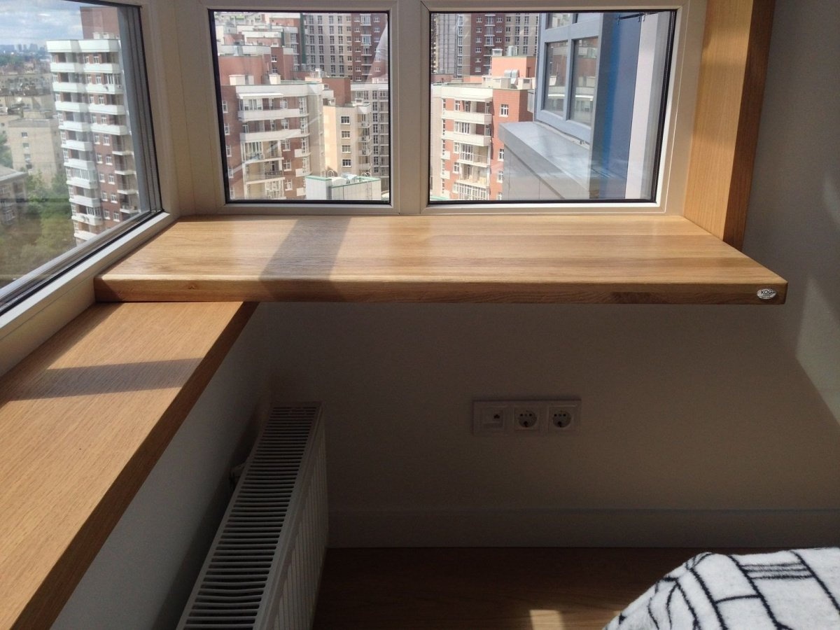 Внутри комнаты столешница-подоконник может иметь ширину от 60 до 100 см, обеспечивая прекрасную функциональную зону для работы. Ее также используют в качестве продолжения туалетного столика, достаточно ширины 50-60 см.