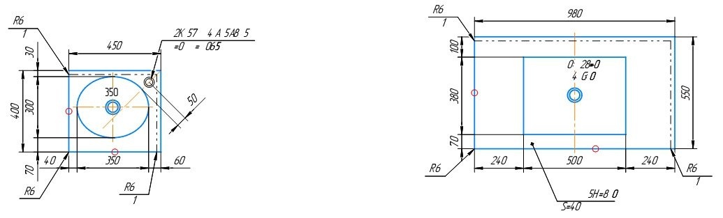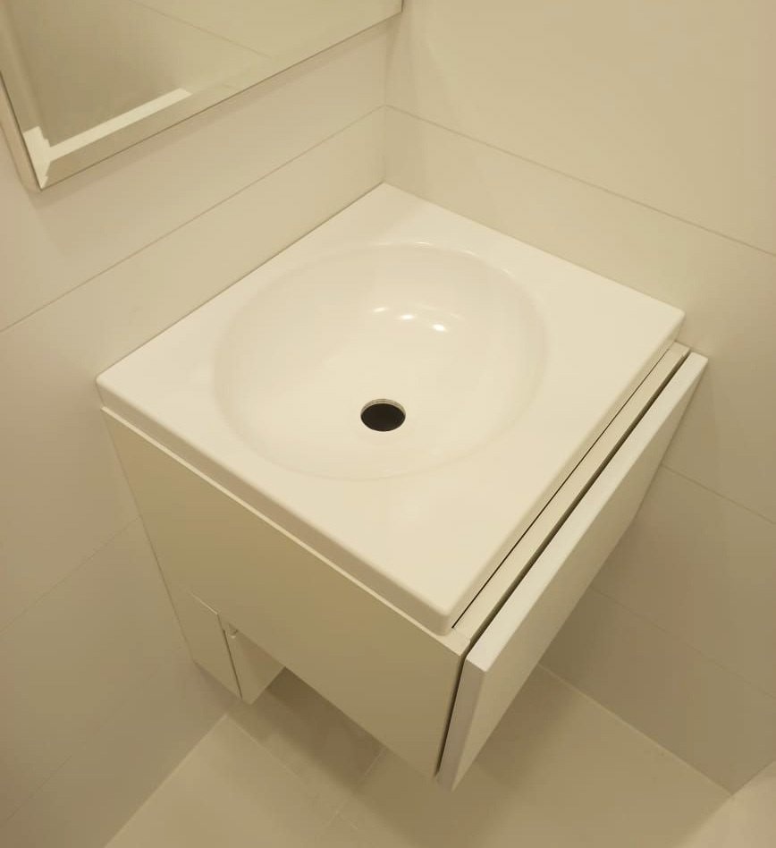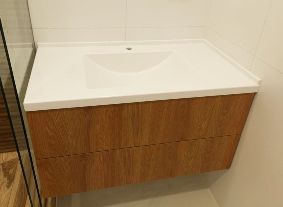 Проект подразумевал изготовление двух небольших столешниц с тумбами в ванную комнату. Комплект подвесной в обоих случаях.
