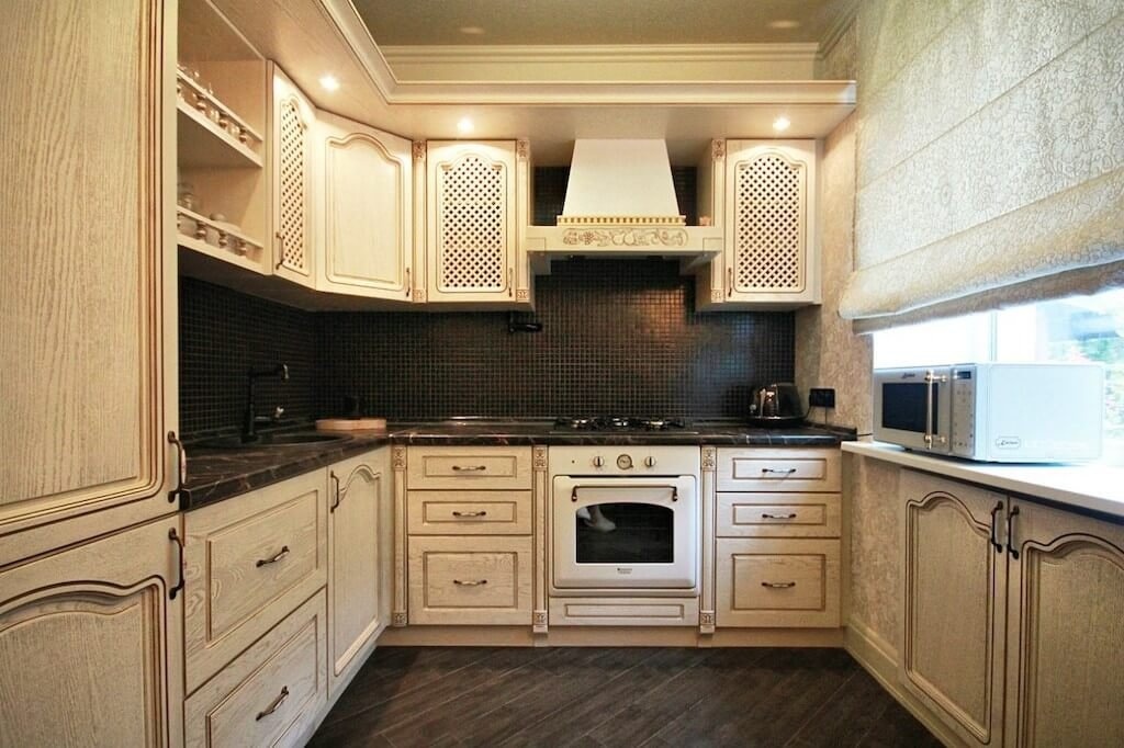 Внимание! Для классического стиля подходит матовый фасад с рамками. Если хорошо подобрать ручки, то не придется часто убираться.