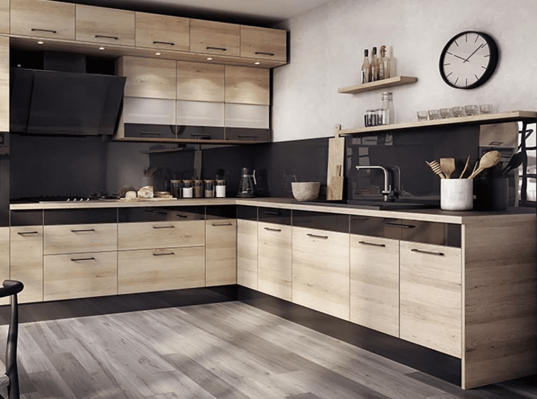 Еще один вариант покрытия столешницы – ламинат МДФ. Он имеет красивый вид, напоминающий древесину, а также хорошо сочетается с интерьером. Для защиты поверхности можно использовать огнеупорное стекло.