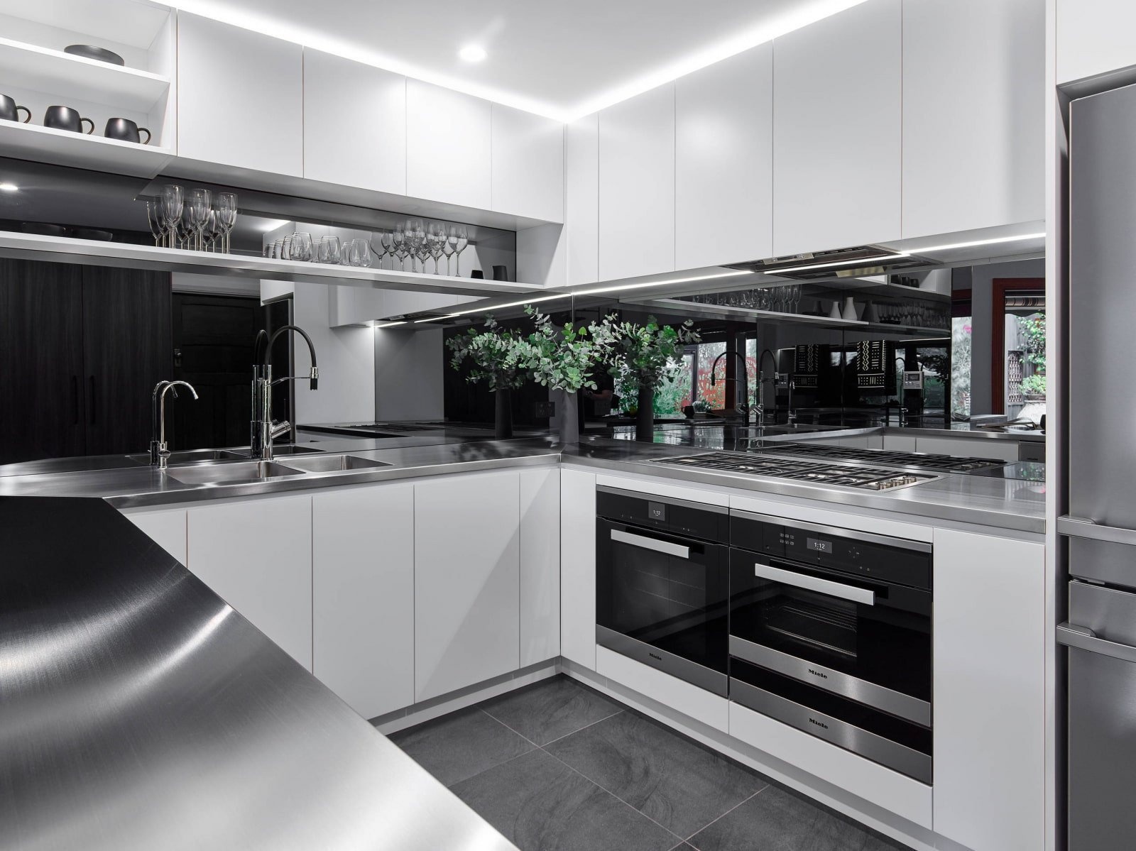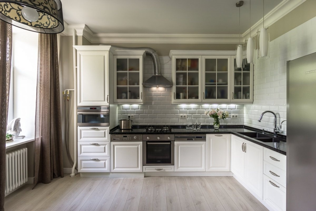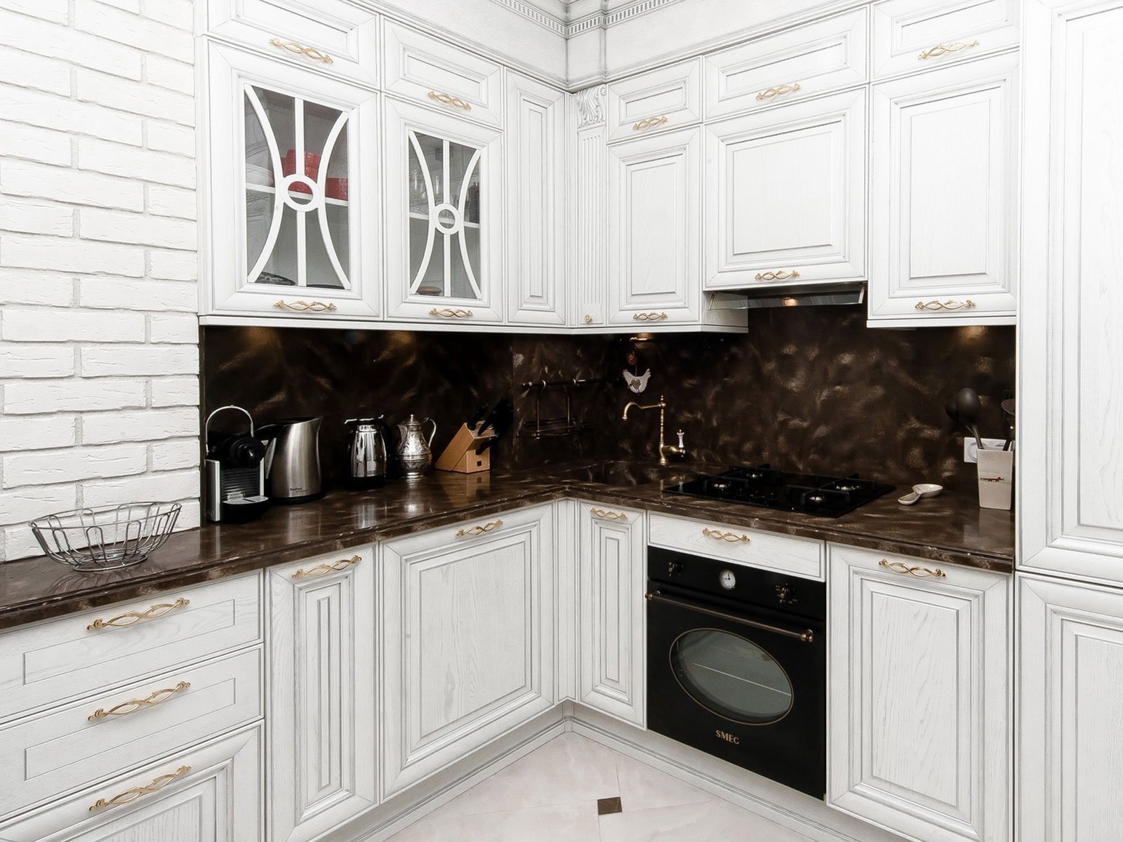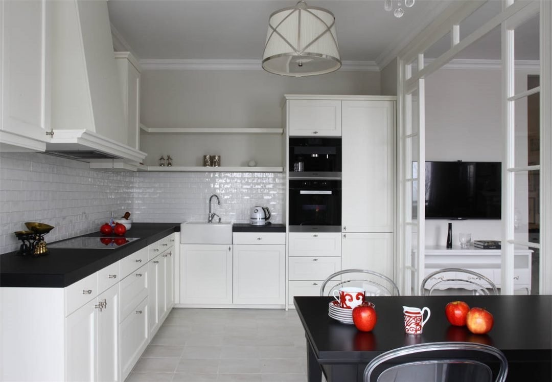 Помещение для приготовления пищи – это то пространство, которое можно оформить в любом из существующих стилей. Чтобы интерьер выглядел как единое целое, необходимо уметь сочетать белый фон и темные детали. Во втором случае речь идет о столешнице.