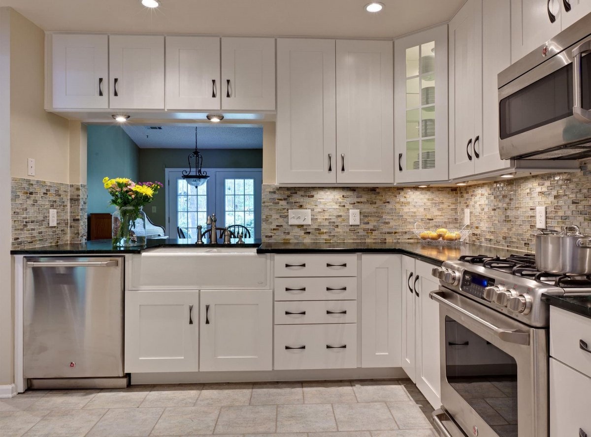 Белоснежное сияние всегда ассоциируется с элегантностью. Ведь есть много преимуществ в таком помещении, особенно в плане увеличения пространства и обилия света. Белый отлично сочетается с практически любым оттенком. Черная поверхность идеально дополняет белые фасады. Очень эффектно будет смотреться белый фартук из плитки, а также мозаичная комбинация черно-бело-серых оттенков. Можно подобрать мозаику как в контрастных цветах, так и с плавным переходом между ними. Интересное решение – черный фартук, соответствующий столешнице.