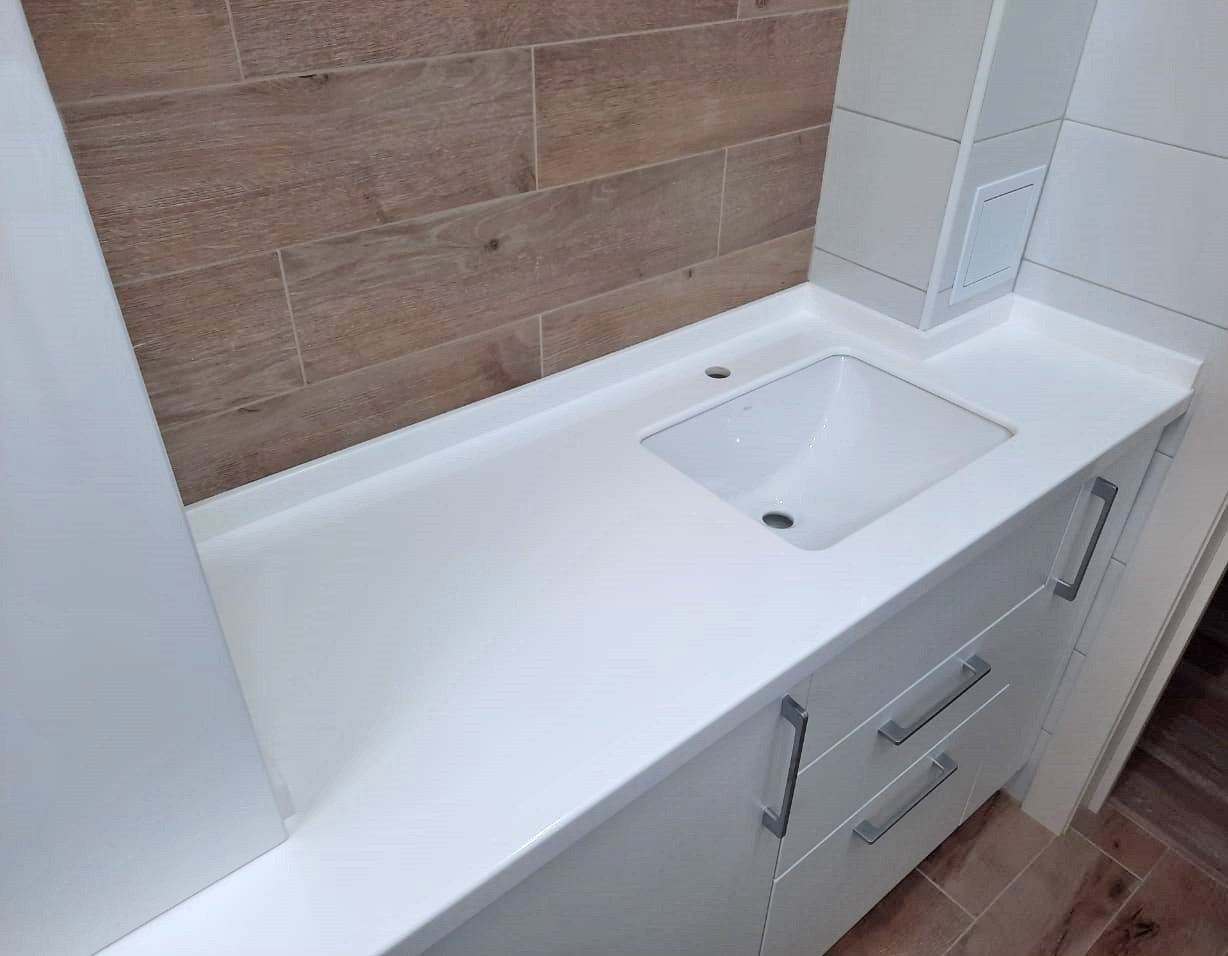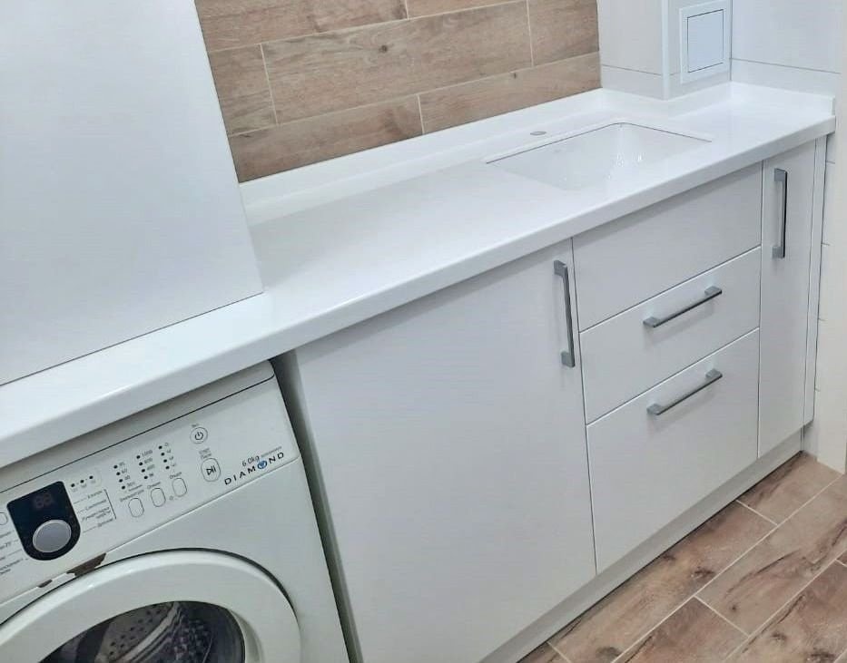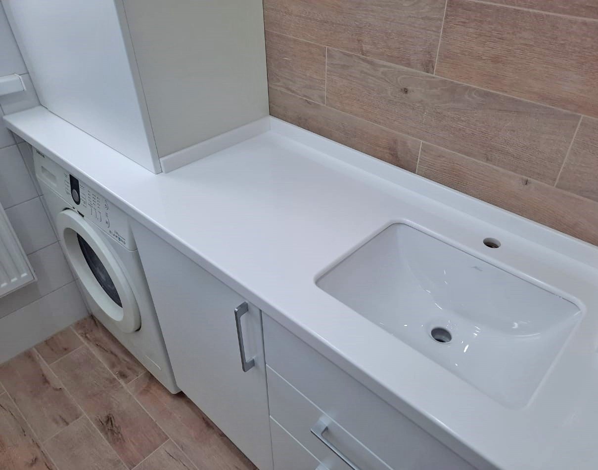 На тумбу установлена столешница из искусственного камня, производителя Flex S028. Акриловый камень не впитывает влагу и устойчив к перепадам температуры. Изделие с такой столешницей прослужит вам более 50 лет.
