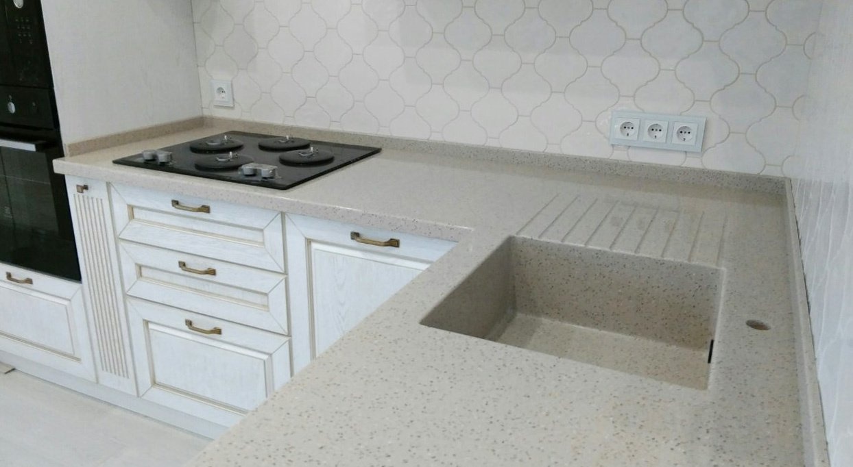 Привычнее думать, что эти две детали всегда идут в комплекте. Но сейчас многие выбирают отдельно гарнитур и отдельно столешницу. Конструкцию и наполнение модулей можно заказать где угодно, а столешницу из искусственного камня изготавливают далеко не все мебельные компании. Такое изделие выбирают те, кто ценит эстетическую красоту, любит практичные и долговечные вещи. Как говорится, "поставил и забыл".