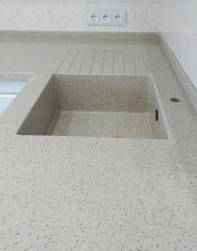 Для этого проекта мы использовали искусственный камень Montelli Cervino D. Цвет камня - бежевый с темными вкраплениями. Дополнительно к столешнице изготовили накладные бортики Н = 40 мм.