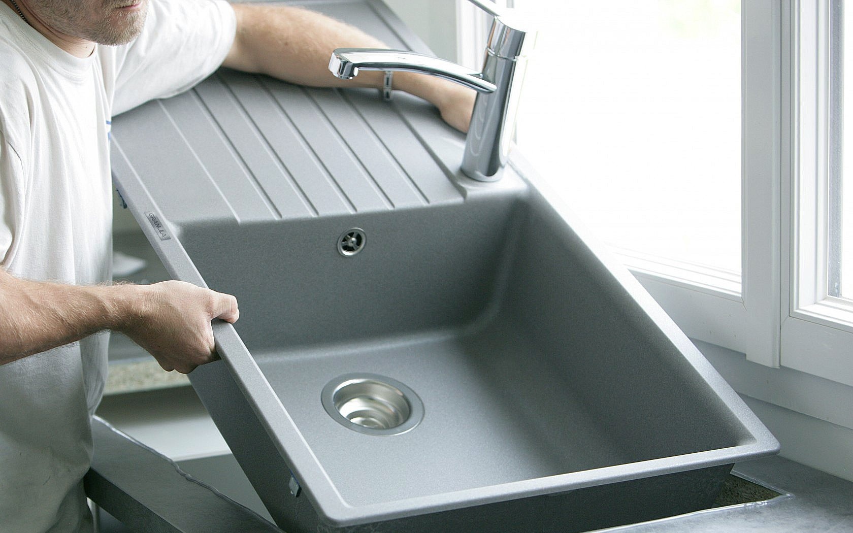 Раковины, изготовленные из натурального камня, например, гранита, представляют собой цельное и прочное изделия. Однако в таких мойках часто отсутствуют отверстия для установки смесителя и слива.