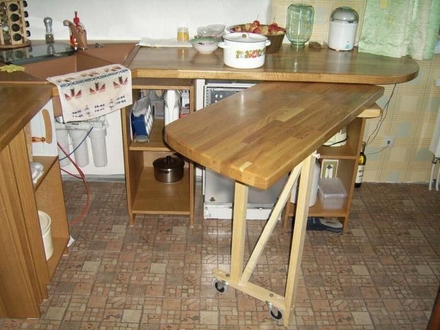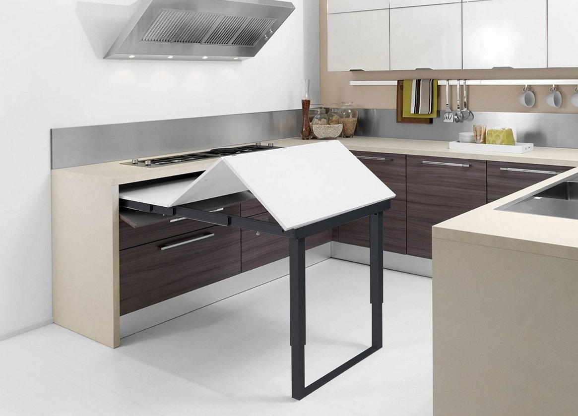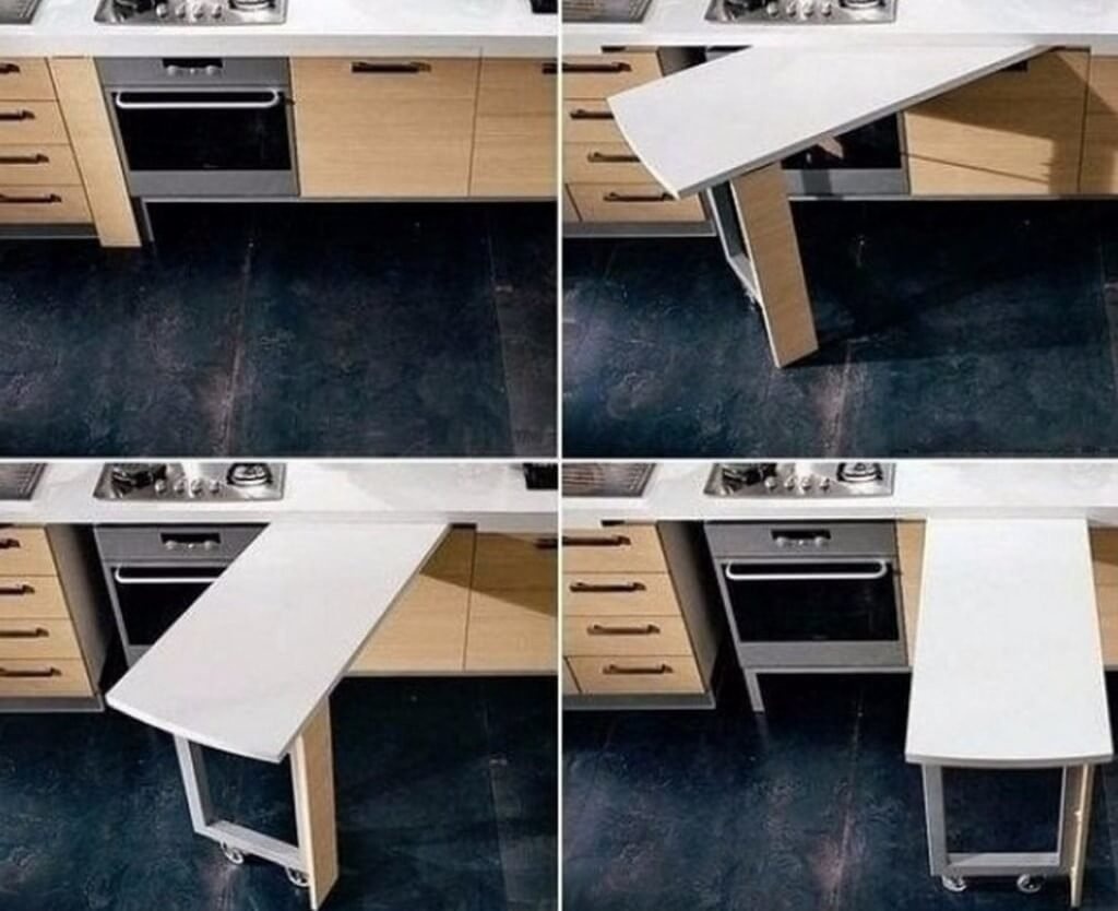 Чтобы освободить место на кухне, можно установить выдвижной стол. Это позволит разместить в помещении более важную мебель.