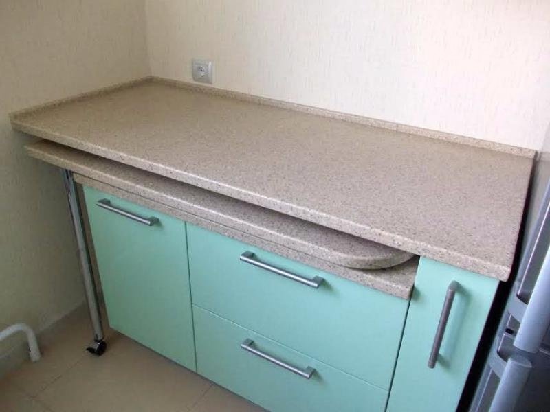 Столешницы из дерева или натурального камня отличаются большим весом. Если решили предпочесть такие изделия, то уделите внимание выбору направляющих. Они должны быть качественными. Камень и дерево нуждаются в особом уходе, которым нельзя пренебрегать.
