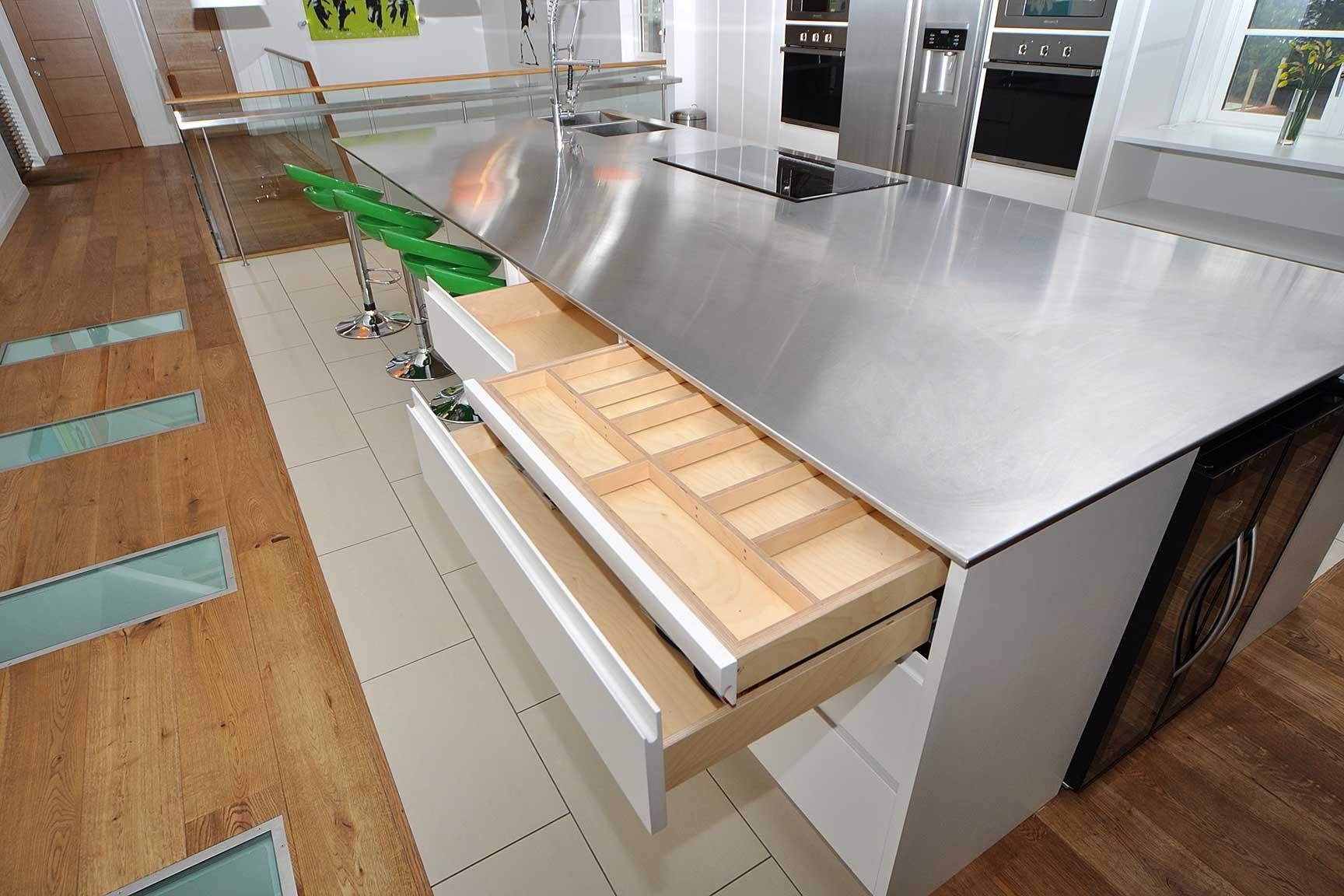 Если на кухне достаточно места, то можно увеличить рабочую поверхность до 900 мм. Тогда глубина ящиков должна составлять не менее 760 мм. Если брать профессиональные кухни или помещения в стиле лофт, то идеальной глубиной столешницы является 1200 мм. Их установка выполняется прямо в центре кухни, что позволяет сделать остров или многофункциональный стол. Это не только создает комфортную обстановку, но и облегчает перемещение поваров по рабочим зонам.